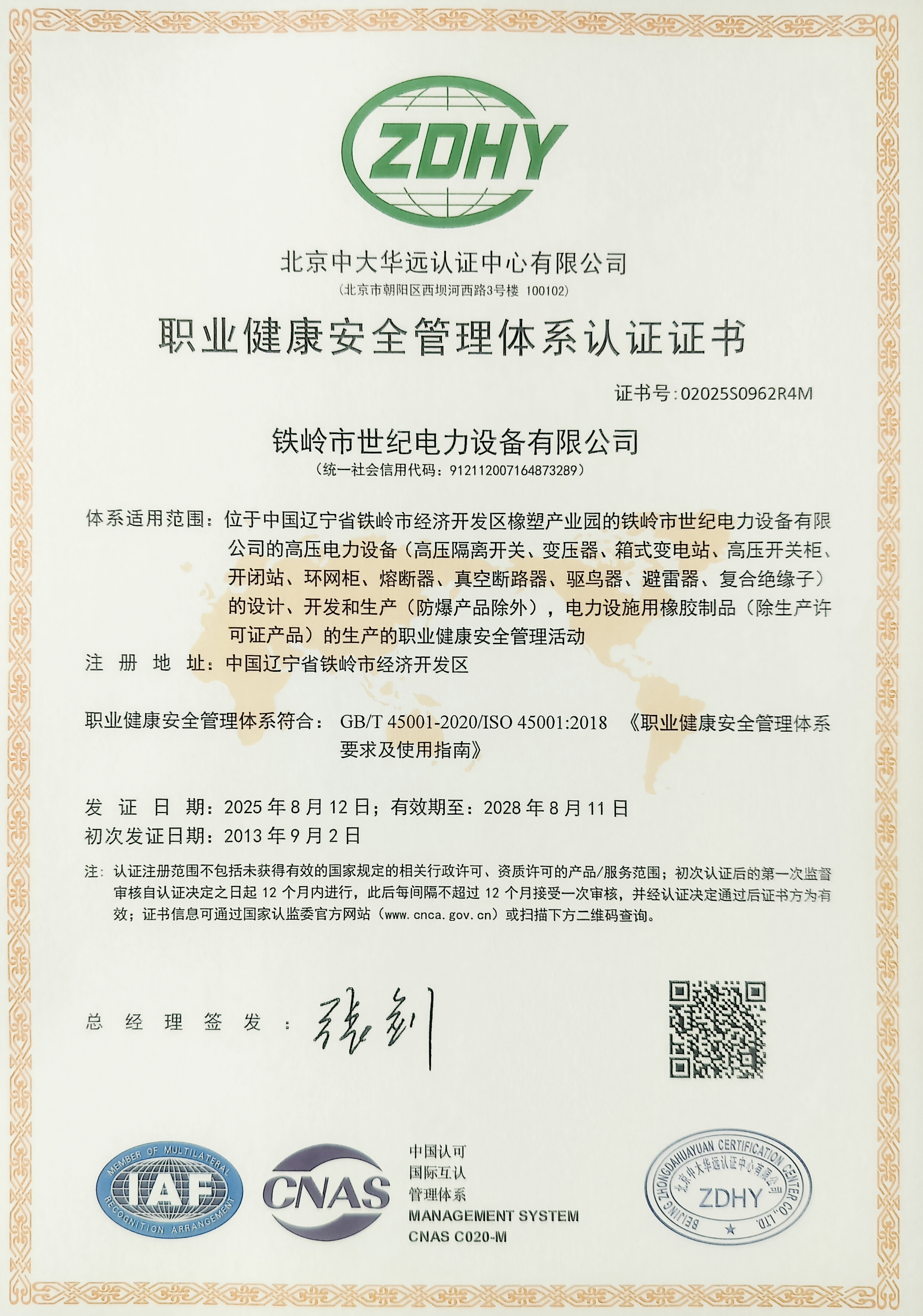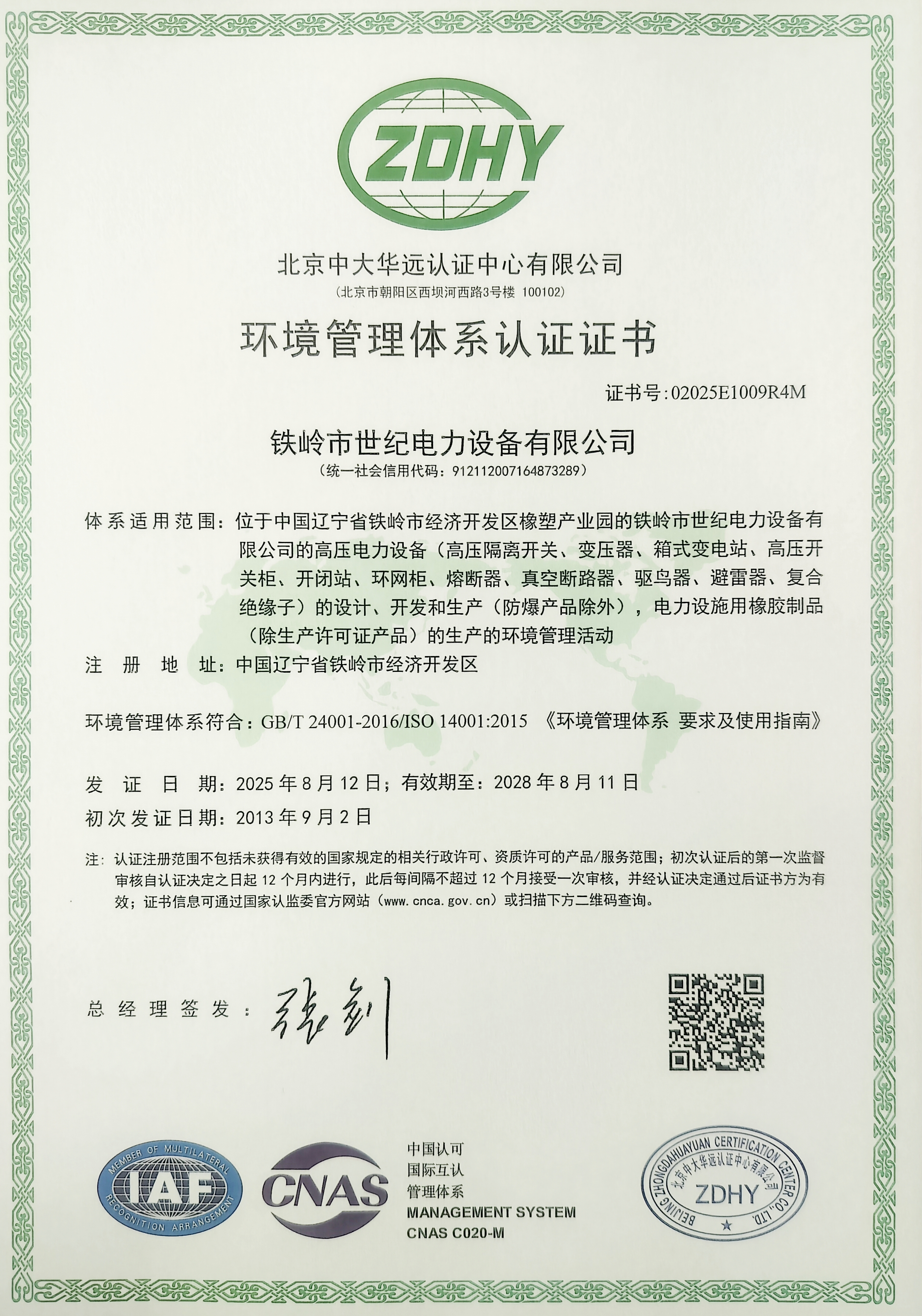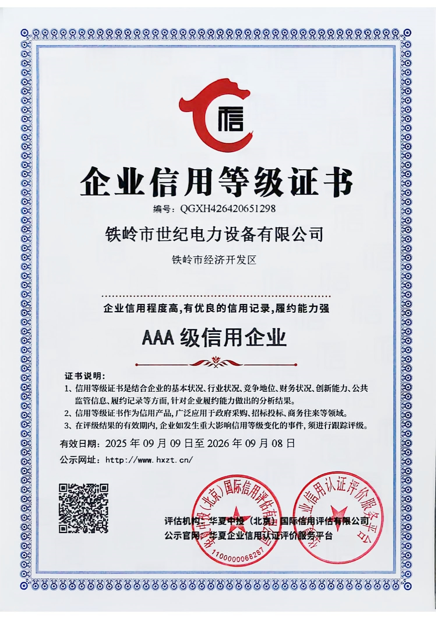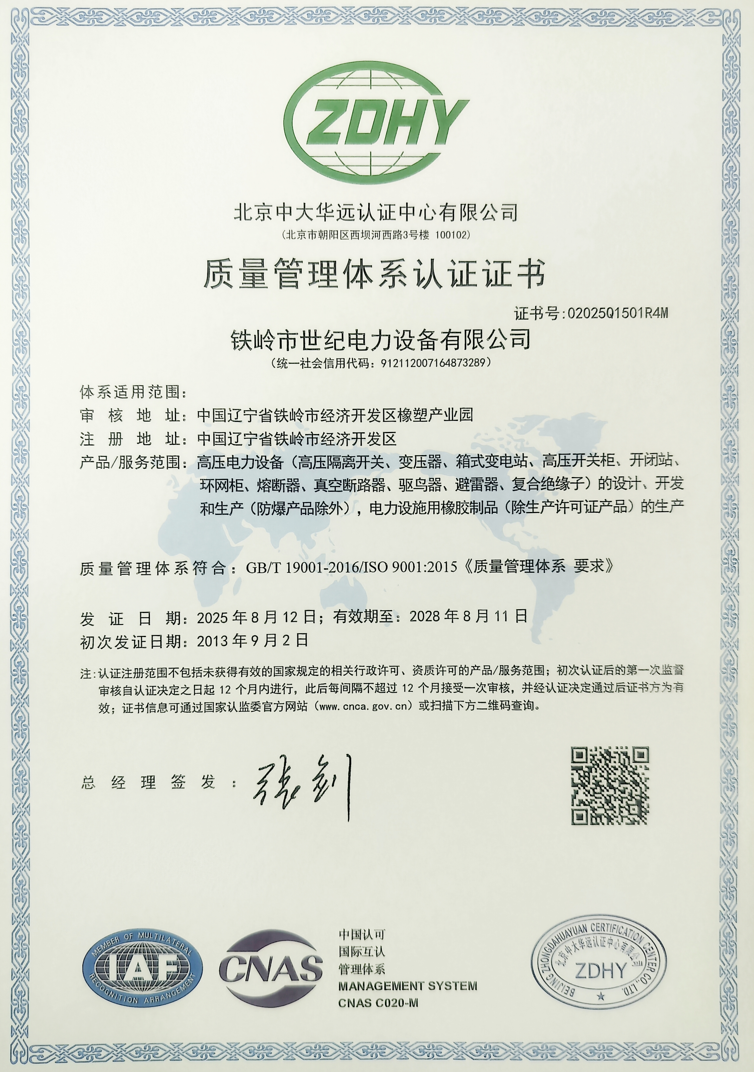 鐵嶺市世紀電力設備有限公司是集科研開發(fā)、生產(chǎn)制造、用戶服務于一體的國家高新技術(shù)企業(yè),始建于1999年,位于鐵嶺經(jīng)濟開發(fā)區(qū),占地面積5萬余平方米,建筑面積2萬余平方米。主要從事國家電網(wǎng)配套戶外高低壓隔離開關(guān)、電力電纜、變壓器成套裝置、高低壓開關(guān)柜、箱式變電站、絕緣子等產(chǎn)品的研發(fā)、生產(chǎn)和銷售。公司現(xiàn)有國家發(fā)明專利6項、實用新型專利9項,公司通過了ISO9001國際質(zhì)量管理體系認證、ISO14001環(huán)境管理體系認證和ISO 45001職業(yè)健康安全體系認證。